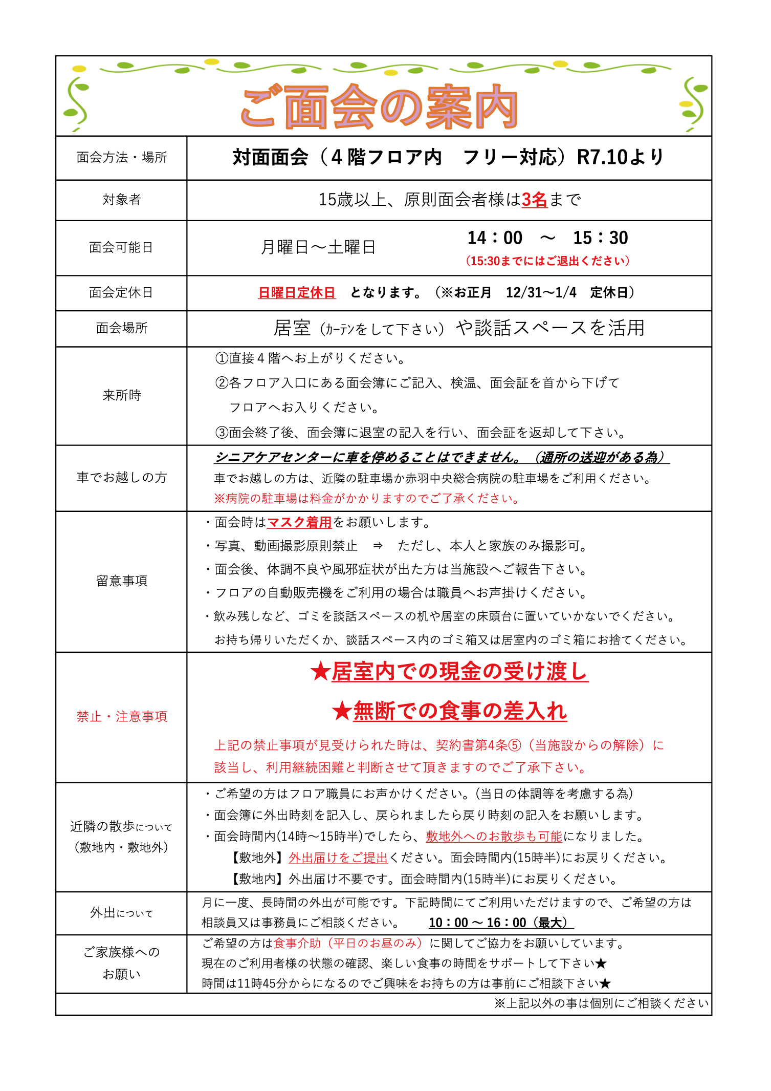 ・面会後、体調不良や風邪症状が出た方は当施設へご報告下さい