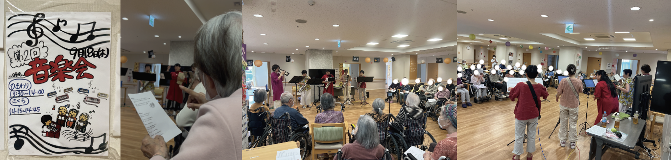 12月25日(水)にクリスマスコンサートを行いました。同日に赤羽中央総合病院で開催した院内コンサート後にシニアケアセンターで演奏をして頂きました。クリスマスメドレーや讃美歌、3曲目には「川の流れのように」を演奏して頂き、皆様で合唱致しました。現在はご面会がフリーの為、ご家族様も演奏を楽しんでいてご利用者様はとてもご満足していました。