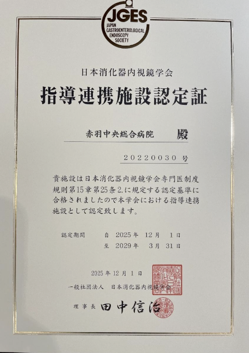 日本消化器内視鏡学会 指導連携施設認定証 2025.11.28 当院は、日本消化器内視鏡学会が定める認定基準(専門医制度規則第 15 章第 25 条 2.)を満たし、「指導連携施設」として認定されております。 すべての上部内視鏡検査(胃カメラ)および下部内視鏡検査(大腸カメラ)は、同学会認定の経験豊富な内視鏡専門医が責任をもって担当いたします。 高度な専門技術と万全な検査体制のもと、患者さまに安全かつ質の高い検査を受けていただけるよう努めております。ご安心して検査を受けられてください。 年末年始診療のご案内 前の記事 ワクチン接種料金表(自費) 次の記事